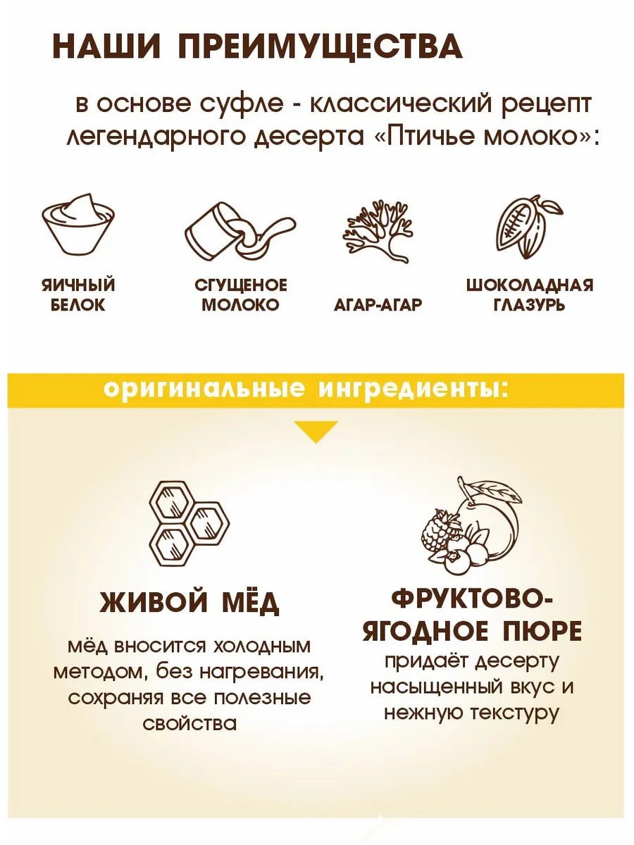 Ищете изысканные шоколадные конфеты в коробке, которые станут идеальным подарком или украшением стола? Набор Медофеты Берестов — это нежные конфеты-суфле, созданные по рецептуре, напоминающей любимые всеми конфеты "птичье молоко", но с уникальными натуральными добавками. В ассорти входят 4 вкуса ручной работы, которые покорят даже самых взыскательных сладкоежек: